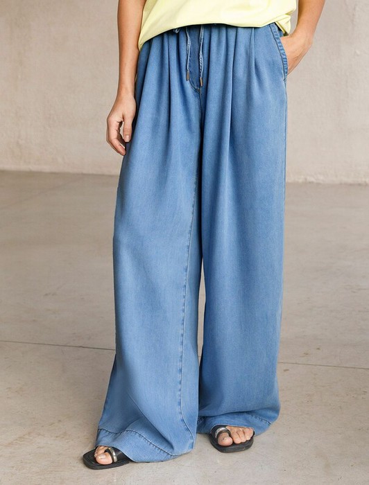 Эффектные брюки-палаццо светло-синего цвета из джинсового лиоцелла плотностью 7,8 OZ отлично подойдут для лето и весну. Свободные и легкие палаццо смотрятся стильно и незаменимые в гардеробе женщин. Благодаря удобному эластичному поясу и защипам в области талии они хорошо садятся на разные типы фигур, скрывают недостатки и создают модный силуэт. Такие повседневные широкие брюки комфортно носить девушкам и женщинам маленького и высокого роста, представлена различная ростовка. Их фасон универсальный: оптимален для офиса, прогулок, встреч или отдыха. Ткань сочетает прочность и мягкость лиоцелла с вискозой, что делает её невероятно комфортной, дышащей, устойчивой к сминанию и идеально подходящей для чувствительной кожи. Благодаря нежным тактильным ощущениям, будто шелк, от которого ощущается приятная прохлада, штаны отлично подходят для создания легких летних образов или стильных ансамблей на каждый день засчет своей универсальности. Тонкие джинсы можно сочетать в стиле кэжуал, а также создавать монохромные обра