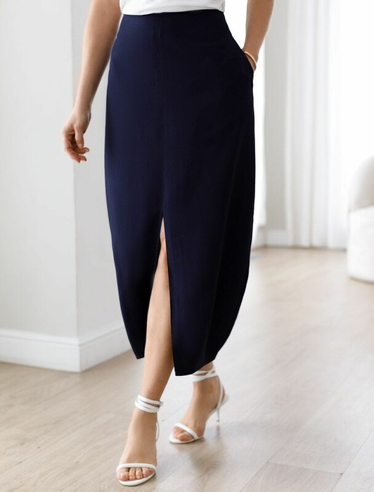 Юбка-тюльпан темно-синего цвета выполнена из плотного лиоцелла. Лиоцелл это более дорогой и экологичный вариант вискозы, очень прочный и шелковистый.  Необычный акцентный крой юбки будет притягивать внимание окружающих. Форма тюльпана достигнута с помощью дополнительных вытачек и швов спереди и сзади. Приятным комфортным дополнением этой модели являются карманы в боковых швах. Разрез добавляет образу легкости и динамики. Юбка подойдет на большие размеры, на высокий рост будет длина миди,  а низкий рост - длина макси. Такая юбка идеальна для создания современного образа от делового до кэжуал с акцентом на фактуру ткани и оригинальный силуэт.