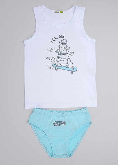 Комплект: классическая майка на 100% хлопке с окантовкой по горловине и проймам, спереди украшена принтом. Трусы для мальчика классической формы из хлопка . По талии и ножке резинка. Декоративные резы спереди .Украшены принтом.