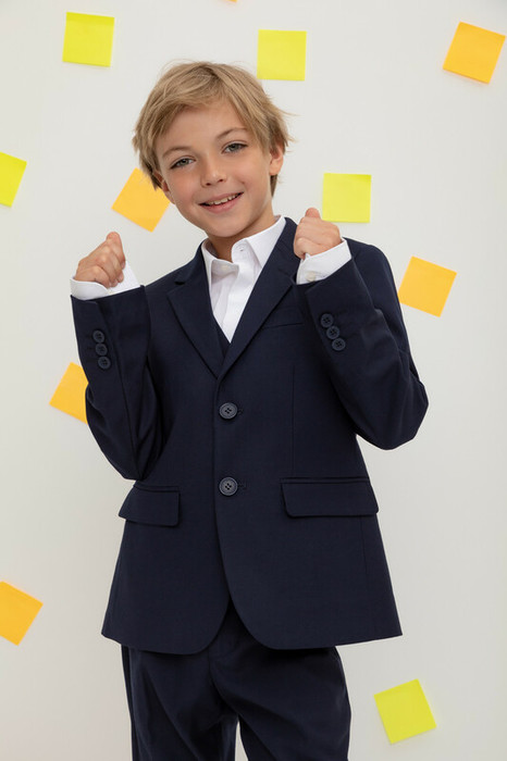 Классический школьный пиджак для мальчика. Cпереди застёгивается на две пуговицы. По бокам два кармана с клапанами. Сзади шлица. Рукава украшены рядом декоративных пуговиц.