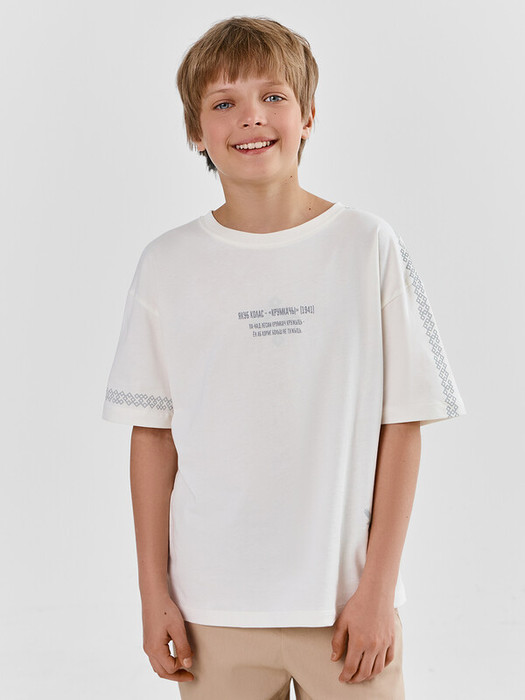 Футболка для мальчиков свободного силуэта, выполненная из хлопковой кулирки. Этот материал обеспечивает мягкость, обладает дышащими свойства и гипоаллергенностью, делая изделие особенно комфортным. Модель с короткими рукавами и круглой горловиной идеально подходит для активных мальчиков. Спущенная линия плеча добавляет особого комфорта и свободы движений, что делает эту футболку отличным выбором для повседневного ношения. Стильно и удобно — эта футболка станет незаменимой вещью в гардеробе каждого мальчика!