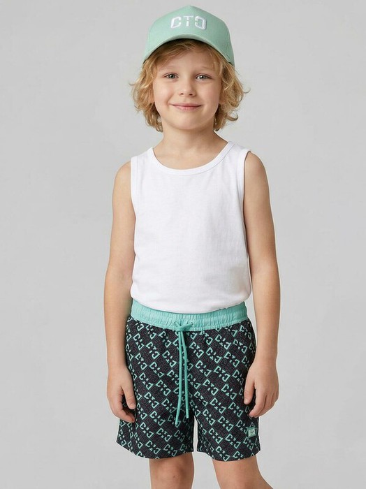 Плавательные детские шорты из быстросохнущего материала с водоотталкивающей пропиткой для мальчика. Бордшорты (swimshort) средней длины. Модель с подкладкой из мягкой сетки в виде трусов, карманы из сетки. Пояс на резинке с дополнительной регулировкой по талии шнурком. Благодаря UF-защите, ткань сохраняет первоначальный вид даже при длительном пребывании на солнце. Отличный вариант для пляжа и бассейна.