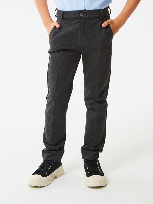 Брюки зауженные из трикотажа джерси для мальчика. Пояс с еврорезинкой сзади. На передней части брюк боковые карманы, горизонтальные защипы и застёжка - гульфик на молнии. На правой задней половинке брюк - карман с узкой листочкой. Отличный вариант на каждый день.