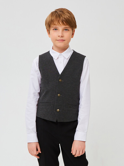 Трикотажный жилет без подкладки для мальчика с V-образным вырезом и боковыми прорезными карманами с листочкой. Спинка дополнена хлястиком с металлической пряжкой для регулировки жилета по полноте. Застегивается на три пуговицы.