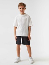 Шорты из 100% вареного хлопка. Свободный прямой крой со средней посадкой талии. Эластичный пояс и ложный гульфик. Карманы с отрезным бочком по бокам и два кармана сзади. Размерный ряд 128 – 176 см.