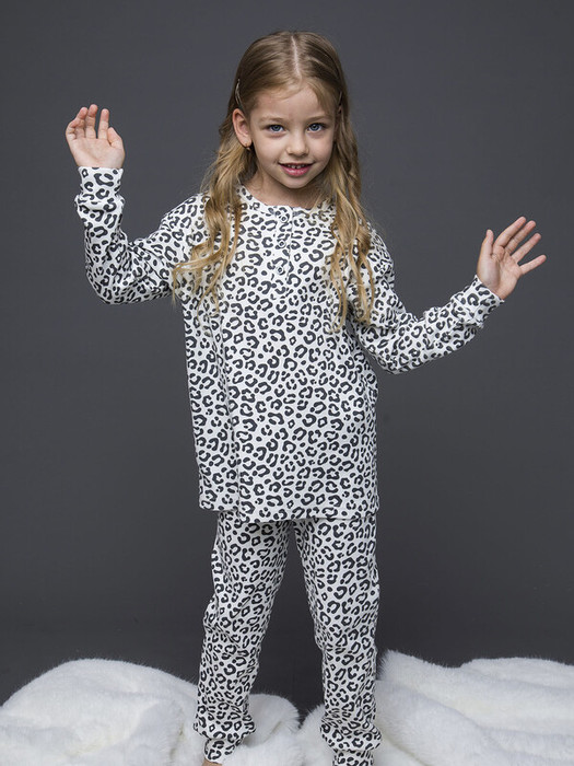 Комплект пижамный для девочки из кашкорсе: футболка с длинным рукавом и брюки.  Мягкий и нежный комплект в бежевом цвете с леопардовым принтом. Подойдет для повседневной носки в любое время года, как дома, так и в путешествиях.Характеристики:Ткань: Кашкорсе 95% хлопок 5% эластанПроизводитель: batik