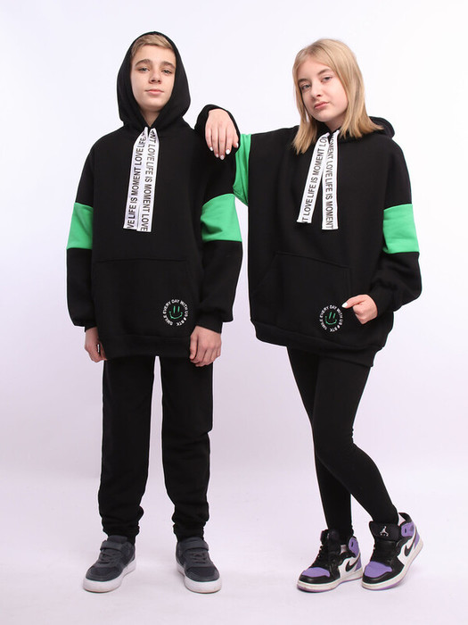 Толстовка унисекс из футера с начесом для детей и подростков. Уютная oversize толстовка с капюшоном и карманами. Расцветка черно-зеленая, карман-кенгуру по центру.