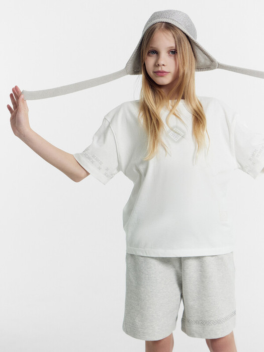 Футболка свободного силуэта. Перед и спинка футболки цельнокроеные. Рукава короткие втачные. Линия плеча спущена. Горловина круглой формы, обтачка из трикотажного полотна рибаны. Шов втачивания рибаны по спинке закрыт бейкой из основного полотна. Низ футболки и рукавов обработан швом в подгибку.