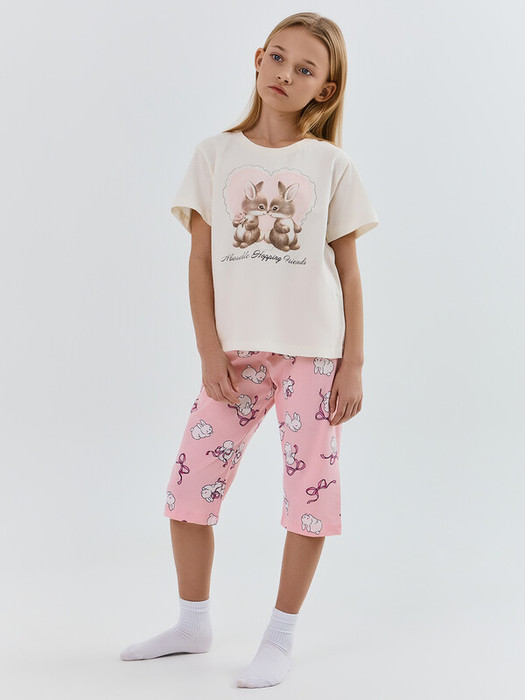 Комплект изготовлен из кулирки. Фуфайка свободного силуэта. Перед и спинка цельнокроенные. Длина до середины бедра. Рукав втачной, короткий. Горловина круглой формы, обтачка из полотна рибана. Низ подложен. Бриджи прямого силуэта. Длина чуть ниже колена. В пояс втачена эластичная тесьма. Низ бридж обработан швом вподгибку.