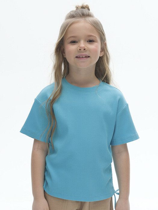 Футболка из модной ткани в рубчик для девочки. Благодаря преобладающим в составе хлопку и вискозе ткань изделия дышит и приятна на ощупь.  Эластан помогает сохранять форму. По бокам модели кулиски с тесьмой — актуальный тренд. С их помощью можно делать стильную сборку с одной или двух сторон. Такая футболка хорошо сочетается с различными шортами, леггинсами, кюлотами или джоггерами.