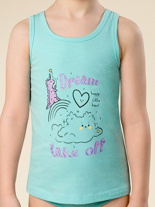 Каждая мама заботится о комфорте своего ребёнка и хочет выбрать для него только действительно качественное бельё. Наша красивая майка для девочки отлично подходит под эти запросы. Модель выполнена из ткани с высоким содержанием хлопка — она приятна на ощупь, великолепно пропускает воздух, позволяя коже ребёнка дышать. Эластан помогает изделию сохранять отличную форму в течение длительного времени. Качественная ткань и правильный крой гарантируют идеальную посадку— ребёнок чувствует себя комфортно целый день. Горловина и проймы обработаны эластичным пайпингом в тон — они не растягиваются и надолго сохраняют прекрасный внешний вид. Модель представлена в трендовых оттенках "персиковый бисквит" и "голубой топаз". Персиковый и голубой - очень нежные, по-настоящему девичьи цвета. Ваша дочка будет в восторге! Майка декорирована милым принтом с дракончиком-единорогом и позитивным текстом. Перевод: "Мечтай Взлезай, счастливое маленькое сердечко".  Принт мягкий и устойчивый, отлично переносит стирки. Такая майка — идеа