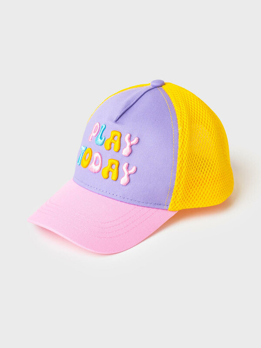 Бейсболка детская для девочки. Передняя часть выполнена из сиреневой ткани с ярким принтом, а задняя часть — из светло-жёлтой сетки, обеспечивающей вентиляцию. Козырёк розового цвета, изогнутый. Сзади предусмотрена пластиковая застёжка на кнопках для регулировки объёма.