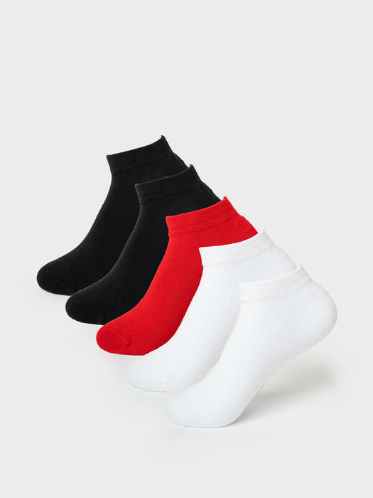 Набор носков для девочки подростка. В комплект входит 5 пар укороченных носков. Носки выполнены в разных однотонных цветах: красный, белый и черный. У каждой пары на стопе сбоку размещена жаккардовая надпись с логотипом и указанием размера. На пятке нанесён силиконовый принт для лучшей фиксации на ноге. Верх оформлен эластичной резинкой. Мысок и пятка имеют анатомическую форму.