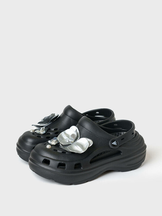 Сабо женские на высокой подошве. Модель выполнена из облегченного и прочного ЭВА. Материал хорошо моется.  Форма модели учитывает эргономику стопы. Оригинальность модели  придают большие съемные цветы-джибицы. Модель имеет перекидной ремешок фиксации ноги.
