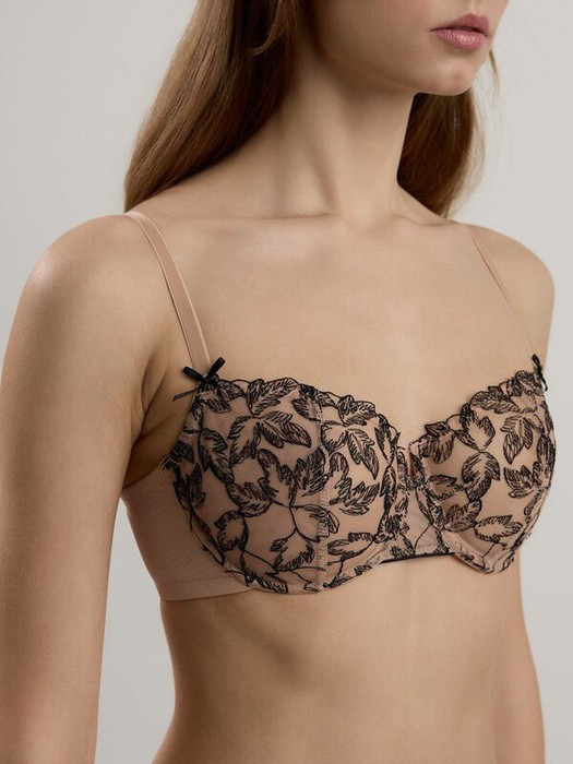 Серия белья Nostalgie выполнена из мягкого сетчатого полотна в оттенке nude и эксклюзивной авторской вышивки, созданной дизайнерами Conte. Благодаря такому решению нежная сетка словно исчезает на теле, оставляя только воздушный рисунок черного цвета, который выглядит как эскиз изящной татуировки.