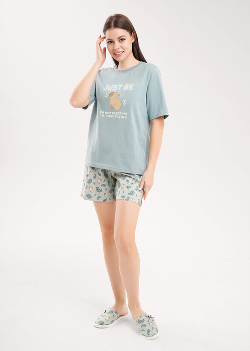 Набор одежды для дома и отдыха из хлопкового трикотажного полотна. Футболка прямого кроя, короткий втачной рукав, округлая горловина с обтачкой. Спереди принт. Короткие шорты свободного кроя, цельнокроеный пояс на внутренней резинке. Боковые разрезы.