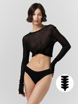 Трусы-бразилиано женские из эластичной сетки. Обработка краев по талии - окантовкой, по ноге - узким кружевом. Хлопковая ластовица. Шов по спинке