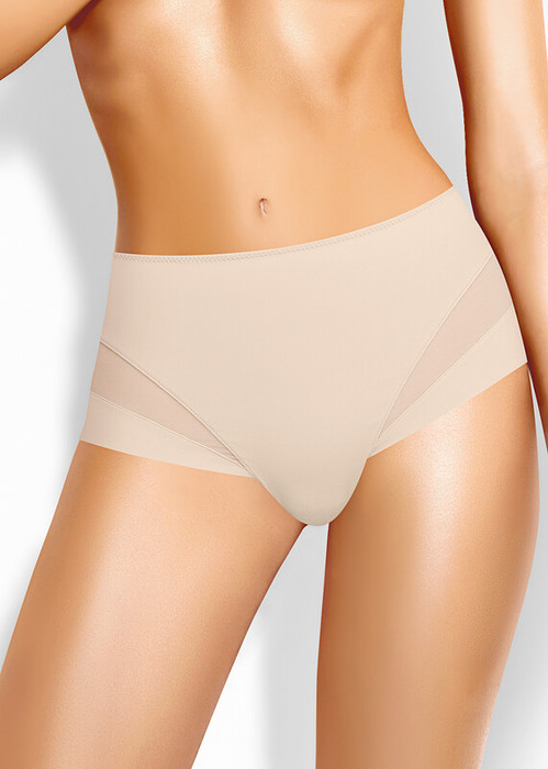 Трусы слипы с завышенной посадкой, сзади и по линии бикини бесшовная гладкая обработка, спереди декоративные диагональные вставки из плотной сетки, перед дублирован сеткой, по талии обработка с зигзагом и узкой резинкой