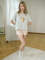Выполнена в двухцветной комбинации: футболка — светло-серая меланж, шорты — нежно-розовые.