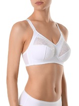Бюстгальтер с мягкими чашками, с боковой корректирующей деталью. Тип каркаса 50. Чашки из рибаны на подкладке из кулирной глади, швы расстрочены бейками из монокапрона. Верхний срез чашек декорирован кружевом шириной, под верхним краем кружева с изнаночной стороны настрочена эластичная тесьма..