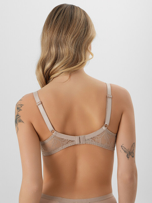 Чашки бюстгальтера выполнены из кружева на мягкой сетчатой подкладке. Они имеют специальные конструктивные швы, которые помогают лучше повторить форму груди для идеальной посадки. Бретели регулируются по длине, что позволяет индивидуально подобрать нужный уровень поддержки. Широкая двойная застежка на спине надежно фиксирует модель, а вся окантовка чашек, бочков и низа выполнена мягкой эластичной тесьмой, которая предотвращает натирание и делает бюстгальтер неощутимым под одеждой.