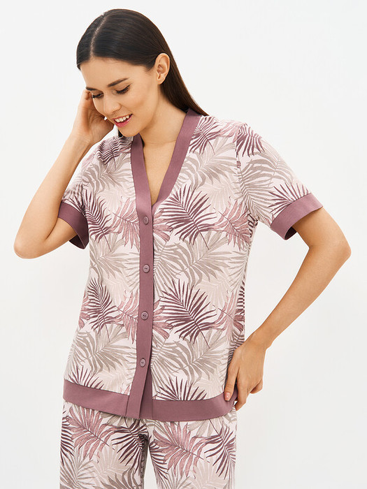 Стильный комплект с пудровым тропическим принтом сочетает лёгкость и элегантность, создавая утончённый образ для дома и сна.