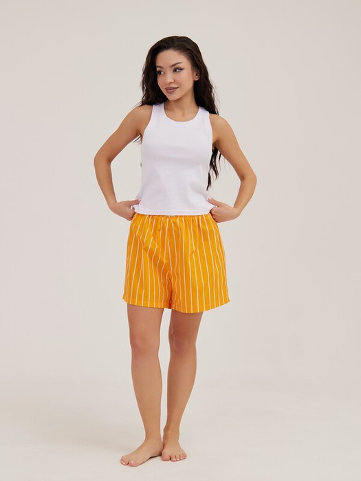 Домашний костюм состоит из майки, выполненной из трикотажного риба, и шорт, выполненных из поплина. Майка-боксерка белого цвета с широкими бретелями.  Короткие шорты яркого желтого цвета в белую полоску, по талии широкая резинка.
