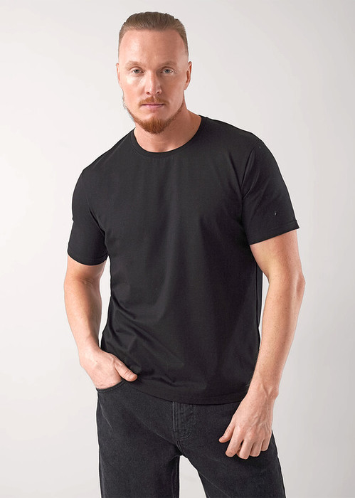 Базовая однотонная футболка стандартного объема с круглой горловиной, втачным рукавом из хлопкового полотна с добавлением эластана. Является неотъемлемой частью мужского гардероба.