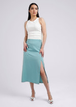 Юбка миди из текстильного полотна штапель. По талии притачной пояс со шлевками. По переду боковой разрез, справа накладной карман с клапаном. По спинке средний шов с застежкой на молнию, вытачки.