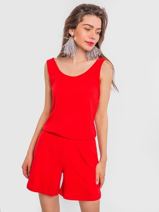 Легкий комбинезон из трикотажного полотна с фактурой "рибана" отлично подходит для долгих прогулок и вылазок на природу. Свободный низ в виде просторных шорт и неглубокий, но эффектный вырез на спине обращают на себя внимание.