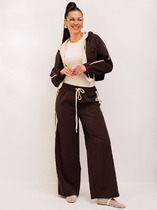 Брюки с посадкой на талии, прямые заужены к низу . Пояс цельнокроеный с резиной внутри. Низ брюк обработан швом в подгибку.