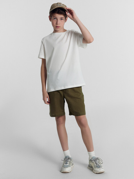 Шорты прямого силуэта. Посадка средняя. Пояс цельнокроеный с эластичной тесьмой внутри. Шов сидения шорт распошит. На поясе пробиты петли, заправлен шнур из основного полотна. По переду имитация гульфика, обработаны карманы с наклонным входом от боковых швов. Низ шорт