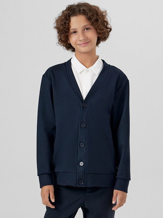 Жакет для мальчиков прямого силуэта. Спинка цельнокроенная, перед с центральной застежкой на пуговицы. Пуговицы на отрезной планке. Горловина V-вырез.