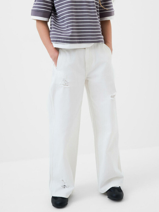 Широкие джинсы для девочки подростка. Модель wide leg выполнена из светлого денима, с прямыми брюками и средней посадкой. Джинсы застёгиваются на молнию и болт. Пояс на талии дополнен внутренней резинкой, что обеспечивает комфортную посадку. Спереди — удобные боковые карманы, сзади — накладные.