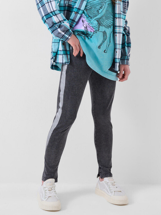 Легинсы для девочки подростка. Модель с высокой посадкой и облегающим силуэтом. Выполнены из хлопкового трикотажа по виду похожего на деним. Пояс выполнен с внутренней резинкой, благодаря чему легинсы хорошо держатся и комфортны в носке. По низу штанин - небольшие боковые разрезы, которые добавляют удобства и стильный акцент. По бокам расположен декоративный принт с серебрянным блеском.