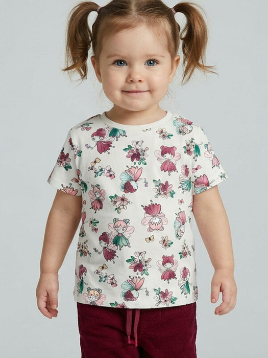 Детская футболка для девочки. Модель прямого кроя, выполнена из эластичного хлопкового трикотажа джерси. Принт с цветами и феями. Горловина круглая. На плече застежка на кнопки для удобного переодевания.