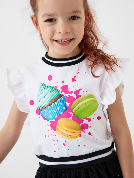 Футболка детская для девочки. Модель выполнена из эластичного хлопкового трикотажа джерси. На груди расположен красочный принт с изображением капкейков и макарунов. Горловина и низ изделия, обработаны эластичным рибом. Рукава - крылышки.