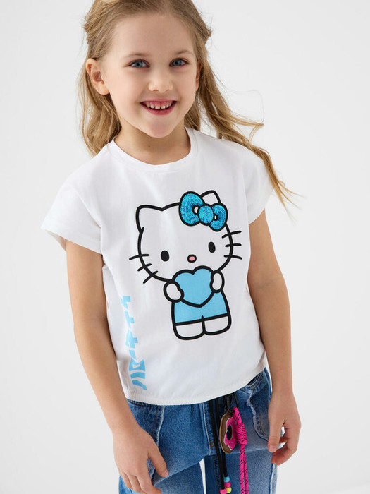 Детская футболка для девочки. Модель свободного кроя, выполнена из эластичного хлопкового трикотажа джерси. На груди расположен крупный принт с любимым персонажем Хэллоу Китти. По низу эластичная резинка.