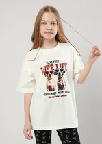 Футболка оверсайз для девочки подростка. Модель выполнена из эластичного хлопкового трикотажа джерси. На груди расположен крупный красочный принт. Горловина круглая, обработана эластичным рибом. В нижней части — небольшая нашивка.