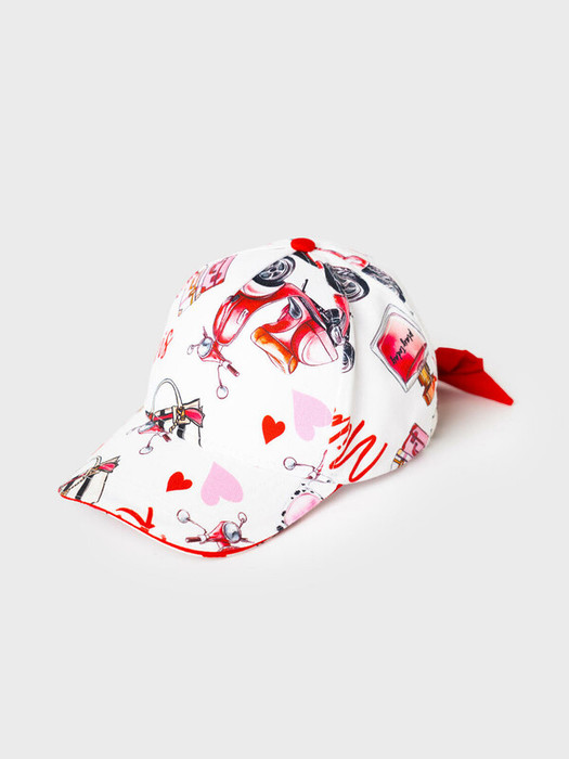Стильная детская бейсболка для девочки. Выполнена из белой ткани с насыщенным принтом: духи, очки, скутер, сердечки и надписи. У бейсболки изогнутый козырек, классическая форма и вентиляционные отверстия. Особое внимание привлекает большой красный бантик на задней части — он делает изделие особенно нарядным.