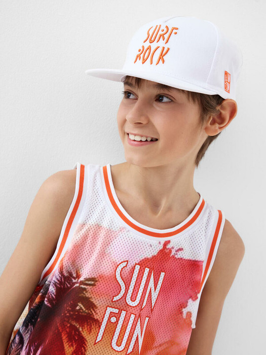 Бейсболка для мальчика подростка. Модель выполнена в классической форме с прямым козырьком. Спереди расположен объёмный вышитый принт. Слева — декоративный бейдж с логотипом. Сзади — пластиковая застежка на кнопках, позволяющая регулировать размер. Отверстия для вентиляции.