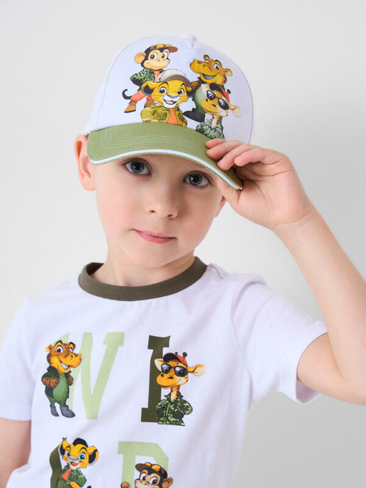 Детская бейсболка для мальчика. Выполнена из хлопкового текстиля. На передней части — яркий принт с изображением животных. Жёсткий изогнутый козырёк защищает от солнца, а сзади — застёжка на липучке, позволяющая регулировать размер. В боковых частях предусмотрены отверстия для вентиляции.