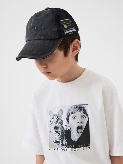 Бейсболка для мальчика подростка. Передняя часть сделана из плотной хлопковой ткани, задняя — из дышащей сетки. Козырёк изогнутый, украшен строчкой и кантами. Слева нанесён принт, а справа — нашивка с логотипом. Размер регулируется с помощью пластикового ремешка на кнопках.