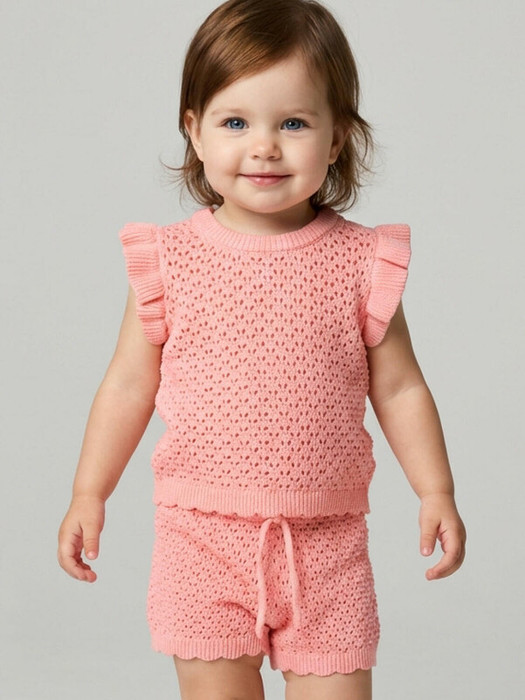 Нежный детский костюм для девочки. Состоит из футболки и шорт. Выполнен из мягкого вязаного трикотажа с ажурным узором, благодаря чему комплект выглядит легким и воздушным. Футболка имеет свободный прямой крой и круглую горловину. Проймы украшены декоративными крылышками, а низ оформлен волнообразным краем, что придает модели нарядный вид. Шорты свободного силуэта, с комфортным поясом на резинке и дополнительным шнурком для регулировки.