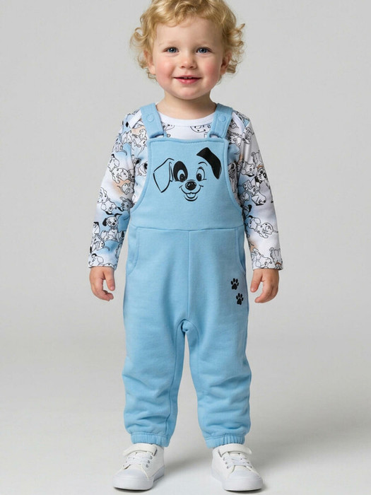 Комплект детский для мальчика. Состоит из двух изделий: боди с длинным рукавом и удобный полукомбинезон. Боди выполнен из мягкого хлопкового трикотажа интерлок с ярким принтом героев «101 далматинец», с застёжкой на кнопках внизу для легкого переодевания. У боди два ряда кнопок - растет вместе с малышом. Полукомбинезон — однотонный хлопковый, на широких перекрестных бретелях, с резинкой на спинке и удобными карманами. На груди размещён крупный рисунок мордочки щенка, а сбоку — милые следы лапок.