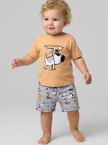 Детский костюм для мальчика. Состоит из футболки и шорт. Выполнен из хлопкового трикотажа. Футболка прямого кроя, с коротким рукавом. На плече застежка на кнопки для удобного переодевания. Яркий принт с милыми собаками. Шорты свободные, с эластичным поясом и шнурком для регулировки посадки.