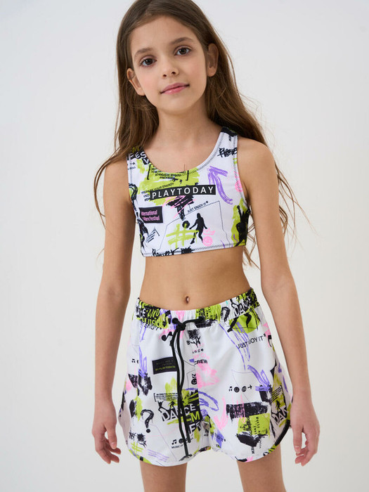 Комплект для девочки подростка: раздельный купальник и плавательные шорты. Верх выполнен в виде топа с широкими лямками. Топ плотно прилегает, имеет круглую горловину и глубокие проймы. На груди топа размещён логотип "PLAYTODAY". Плавки чёрного цвета с удобной посадкой. Внутри изделия мягкая подкладка. Шорты – свободные, с ярким принтом в стиле граффити и надписями.  Пояс на резинке со шнурком обеспечивает комфортную посадку. Благодаря UF-защите, ткань сохраняет первоначальный вид даже при длительном пребывании на солнце. Подходит для плавания и активного отдыха.