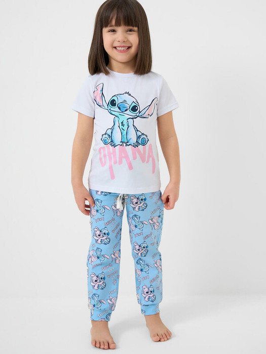 Пижама детская Лило и Стич для девочки. Комплект включает футболку, прямого кроя с короткими рукавами и длинные брюки. Футболка украшена крупным рисунком Лило и Стич. Брюки выполнены с ярким принтом по всей поверхности. Брюки на резинке с манжетами по низу.