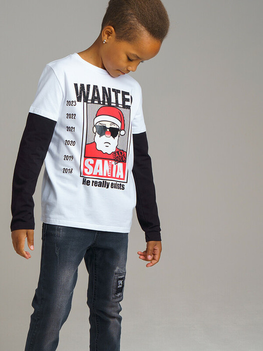 Лонгслив из качественного приятного на ощупь трикотажа. Высокое содержание хлопка 95%. Благодаря наличию эластана в составе ткани изделие проще в уходе и держит форму. Рукав с имитацией многослойности. Новогодний принт с акцентно глянцевой текстурой.
