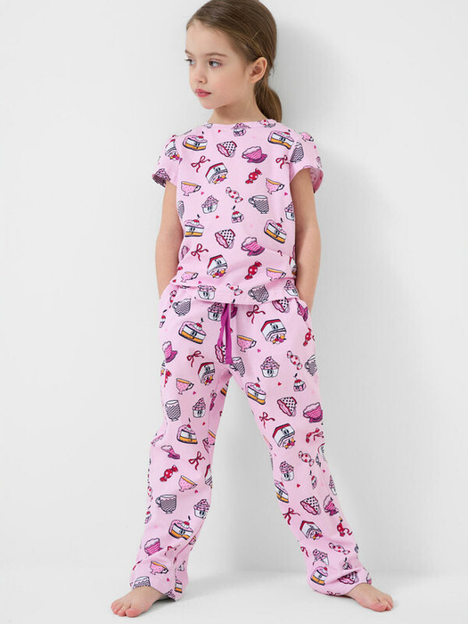Детская пижама для девочки. Комплект состоит из футболки, свободного кроя с короткими рукавами и брюк. Изделие выполнено из мягкого, хлопкового трикотажа и украшено веселым принтом с пирожными, кексами, чашками и конфетами. На брюках мягкий пояс на резинке с декоративным шнурком.